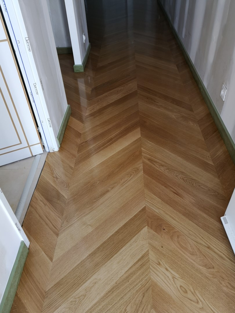 Pose collée en point de hongrie d'un parquet massif brut, dans une villa à Toulouse (70m²)