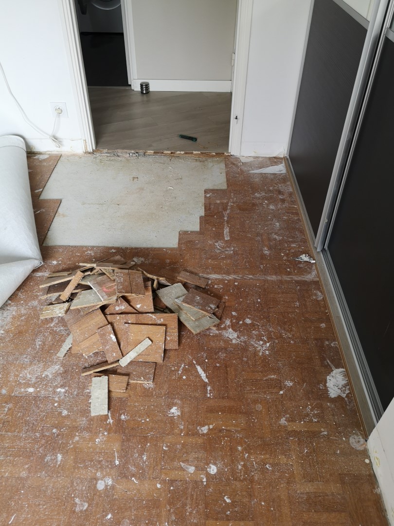 Enlèvement et mise en décharge , pose collée parquet à l'identique