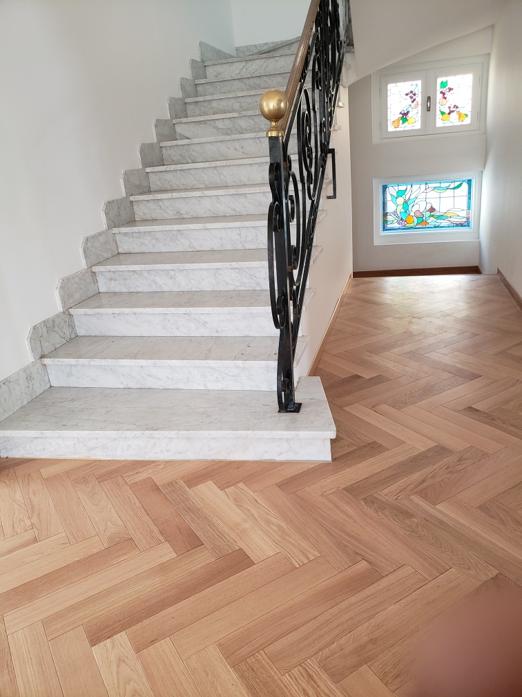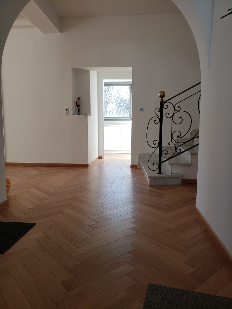 Pose collée en bâton rompu d'un parquet massif vernis usine, dans une villa à Toulouse (300m²)