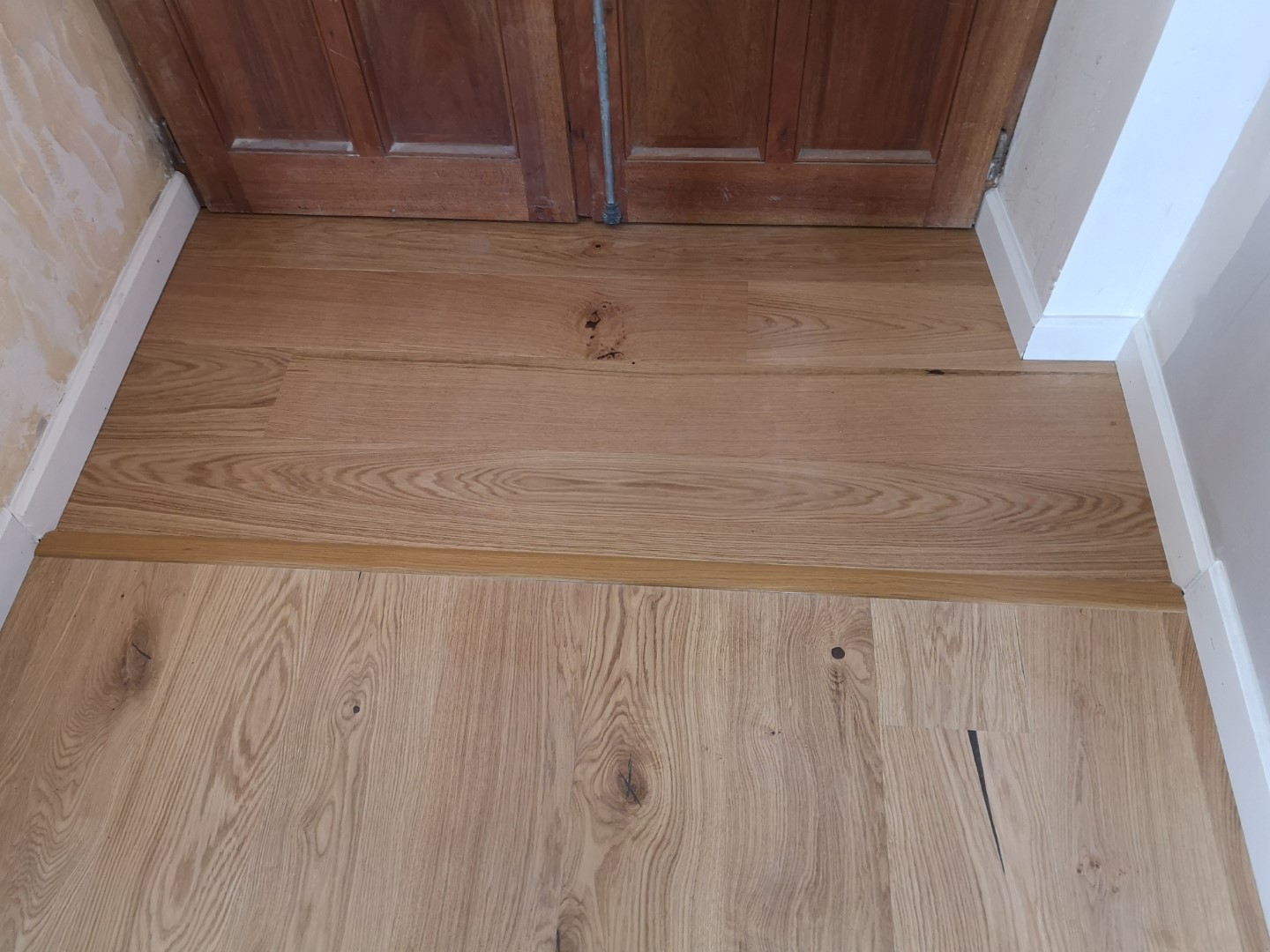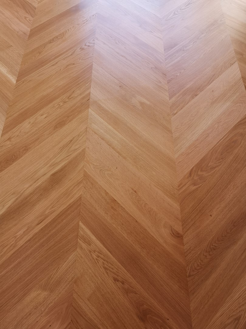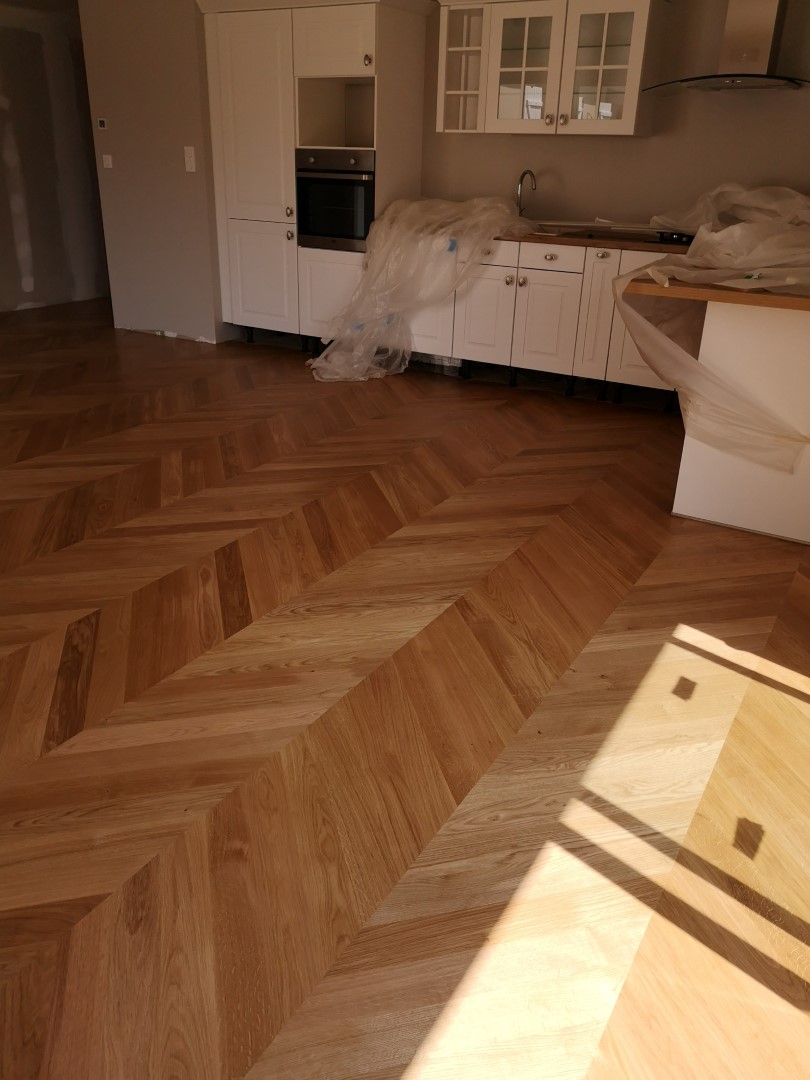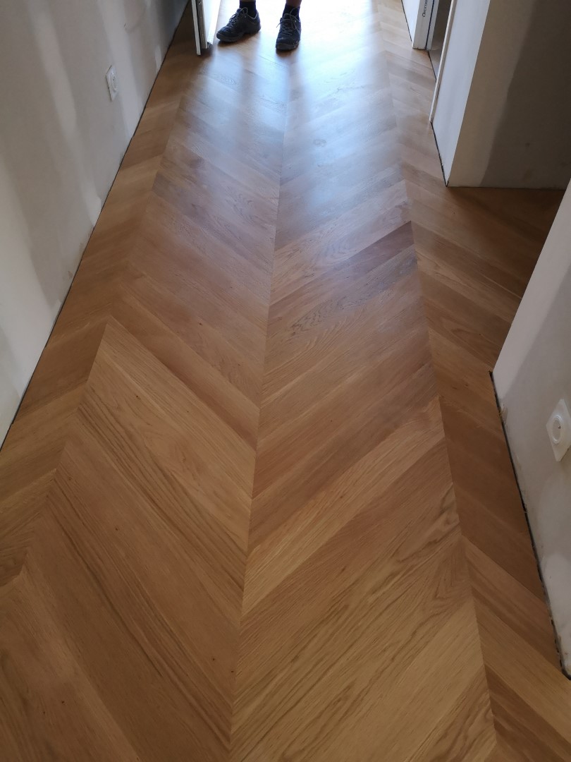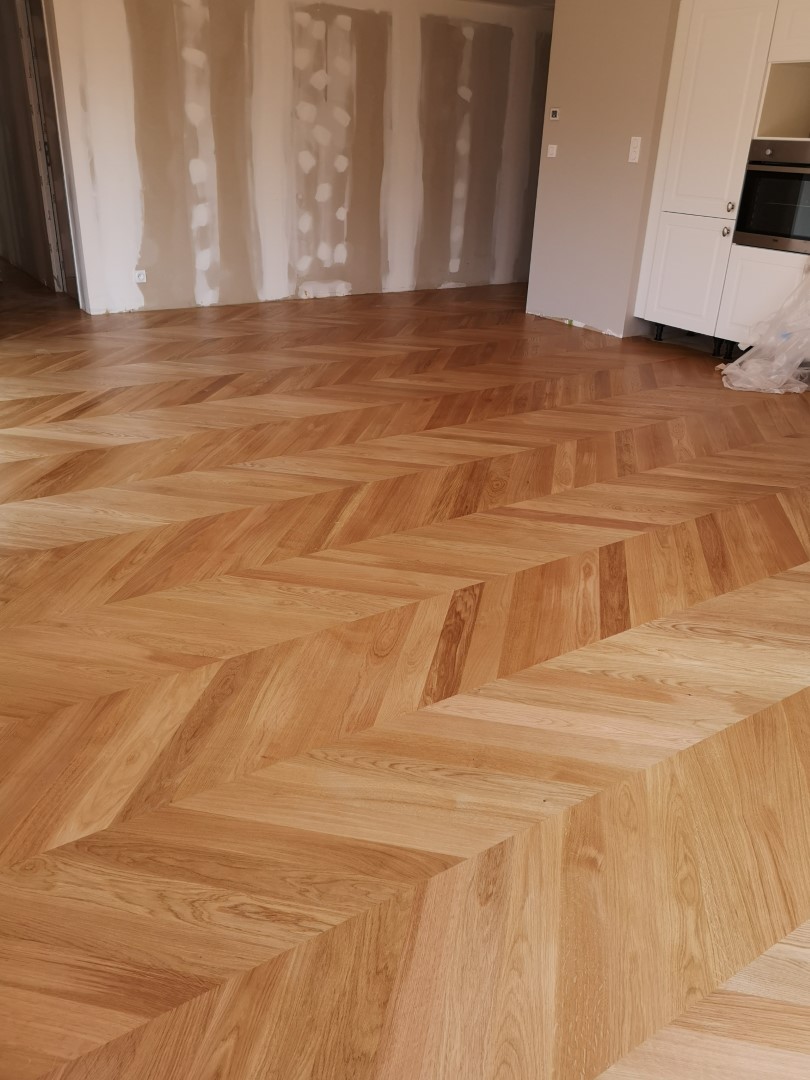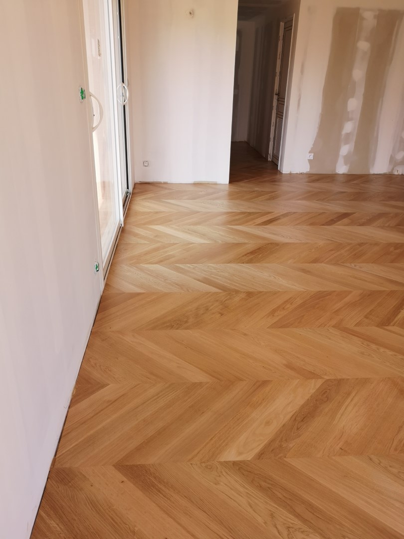 Pose collée en point de hongrie d'un parquet massif brut, dans une villa à Toulouse (70m²)