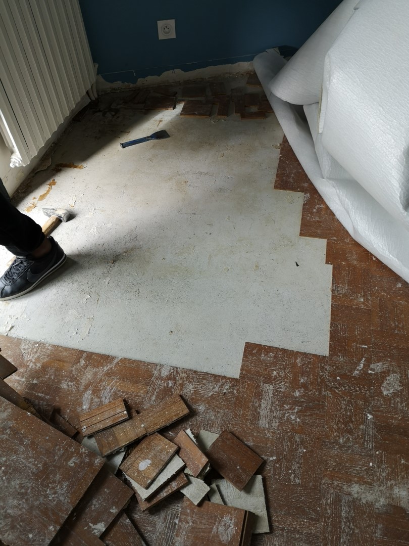 Enlèvement et mise en décharge , pose collée parquet à l'identique